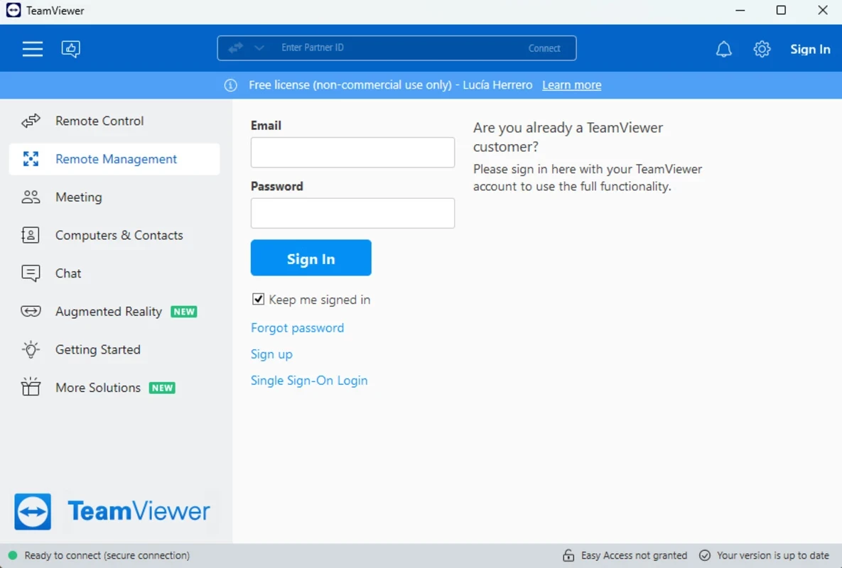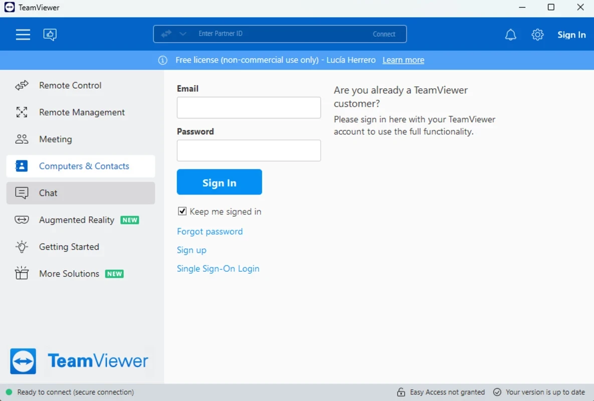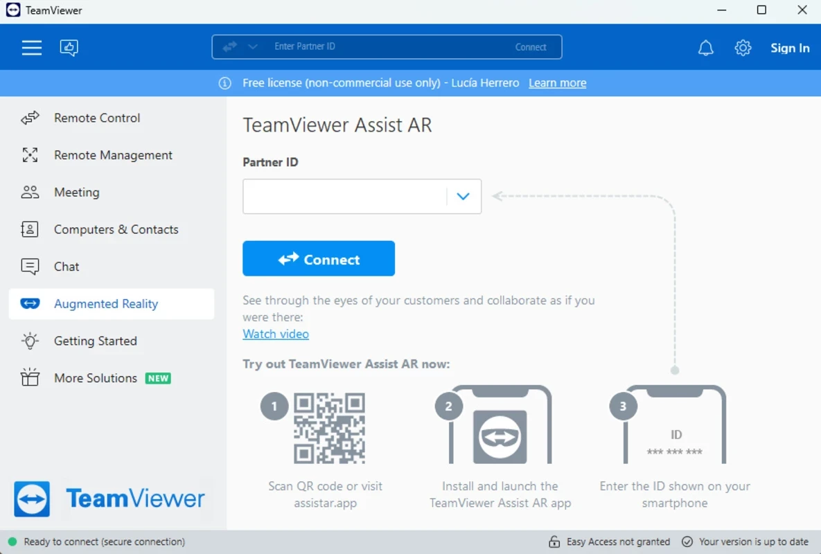 直感的なインターフェースにより、シンプルで素早いリモート接続が可能です。左側のパネルには、「リモートコントロール」、「リモート管理」、「会議」、「コンピューターと連絡先」、「チャット」、「拡張現実」、「はじめに」などのタブがあります。他のシステムに接続中はステータスバーを表示でき、画面上部の「ホーム」、「アクション」、「表示」、「通信」、「ファイルとその他」などのタブを使用して会議を簡単に開催できます。